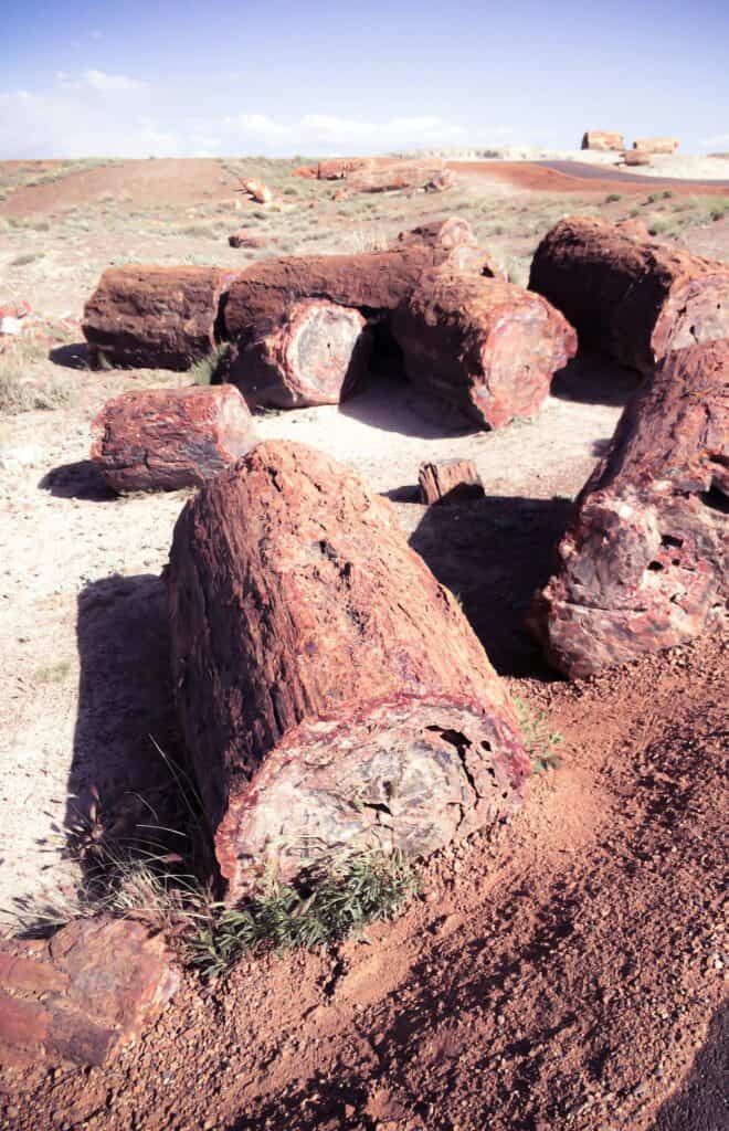 De naam is letterlijk: de “bomen” die je ziet, zijn geen hout meer. Het zijn fossielen—boomstammen uit de late Trias—waarbij het organisch materiaal vervangen werd door mineralen (vaak silica). Daardoor krijg je harde, gepolijste stukken die kunnen glanzen in de zon, met tinten rood, oranje, paars en soms blauwachtig. Dat je hier overal “logs” ziet liggen, in stukken gebroken door erosie, maakt het landschap bijna buitenaards.